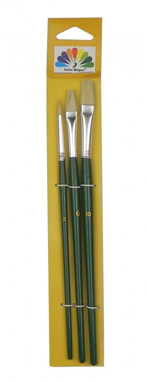Lapos ecset (No. 10): Szélesebb ecsetvonásokhoz, rétegzéshez és alapozáshoz.