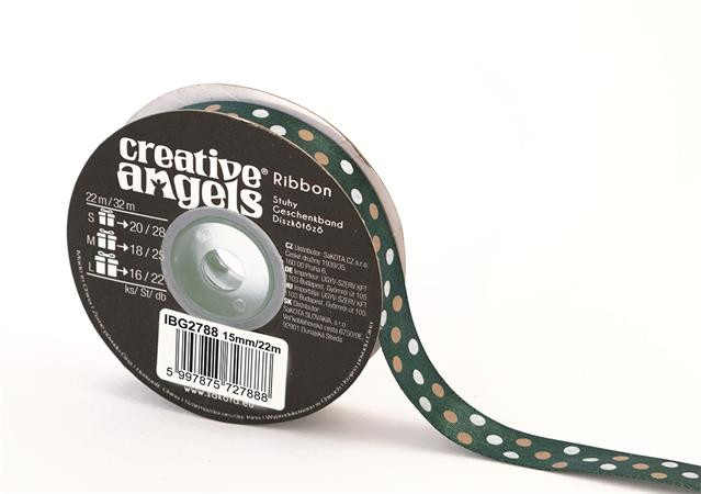 Szatén szalag, 15 mm x 22 m, sötétzöld vegyes pöttyökkel